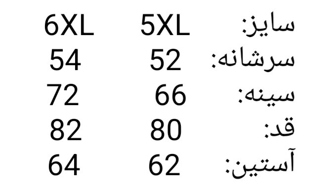 - سایز: 6XL (بزرگ سایز) - مناسب برای افراد درشتهیکل با دور سینه حدود ۱۳۰ تا ۱۵۰ سانتیمتر (برای اندازه دقیق، جدول سایزبندی را چک کنید).