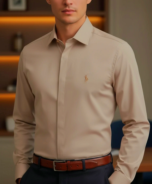 پیراهن مردانه مجلسی رنگ بژ رسمی،کلاسیک،دکمه مخفی