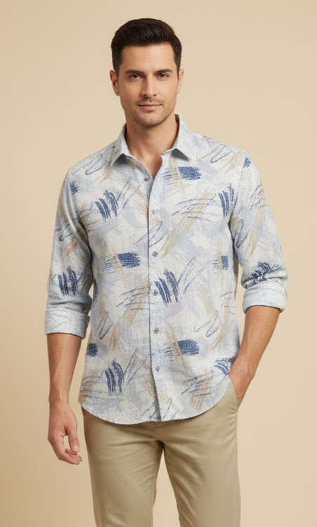 پیراهن مردانه آستینبلند با پارچه طرحدار آبرنگی در رنگهای آبی، کرم و خاکستری، مناسب استایل روزمره و مهمانیهای دوستانه. دوخت باکیفیت، طراحی مدرن و راحتی در پوشش. این پیراهن آستینبلند مردانه با طراحی هنری و الگوی آبرنگی در ترکیب رنگهای آبی ملایم، کرم و خاکستری، انتخابی بینقص برای آقایانی است که به دنبال سبکی خاص و منحصربهفرد هستند. پارچه سبک و تنفسپذیر آن، حس راحتی را در طول روز ایجاد کرده و همزمان ظاهری مدرن و خوشفرم به استایل شما میبخشد. علاوه بر ست شدن با شلوار کتان یا جین، این پیراهن برای قرارهای دوستانه، مسافرت و استایل نیمهرسمی نیز گزینهای عالی است