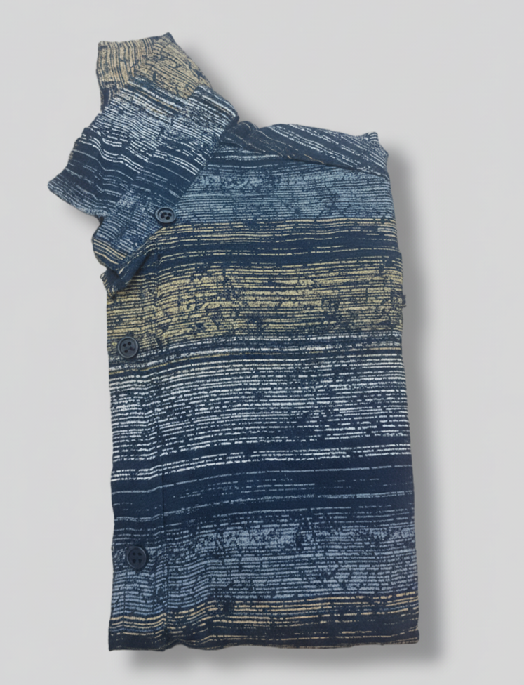 پیراهن مردانه آستین بلند با طرح راهراه افقی و بافت خاص، انتخابی ایدهآل برای آقایانی که به دنبال استایل شیک و اسپرت هستند. رنگبندی منحصربهفرد شامل سرمهای تیره، طوسی دودی و طلایی ملایم، این پیراهن را به یک آیتم خاص برای کمد لباس تبدیل کرده است.